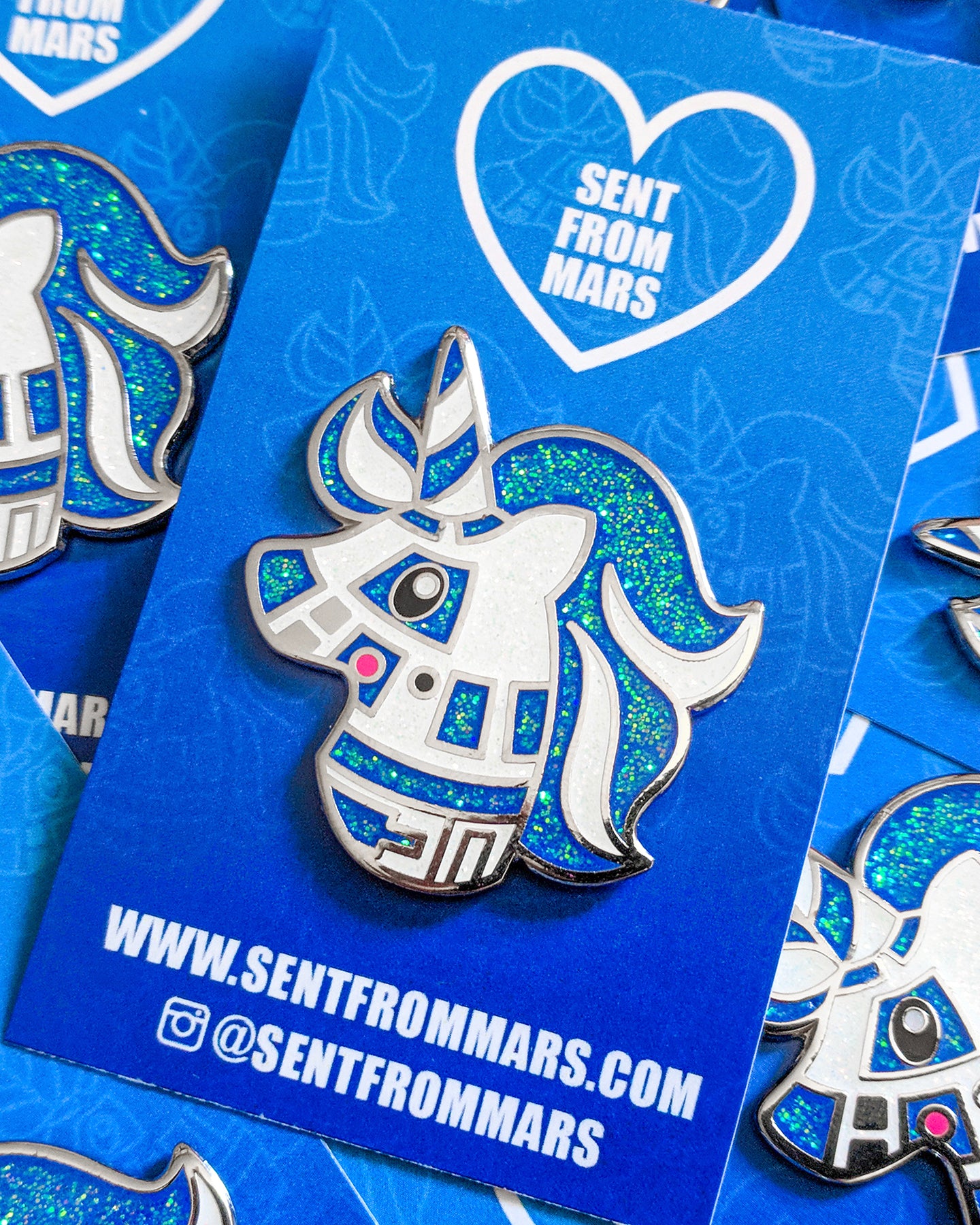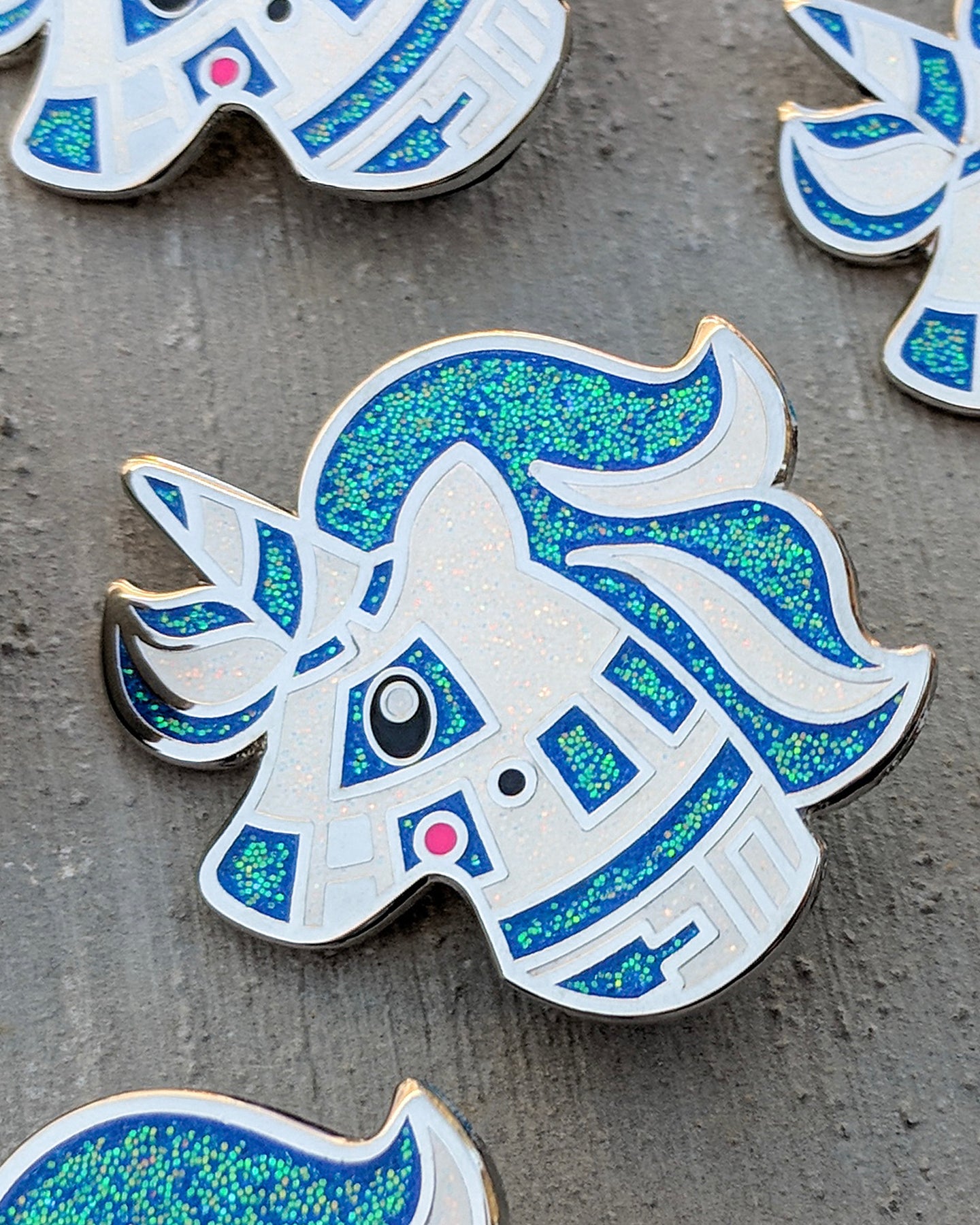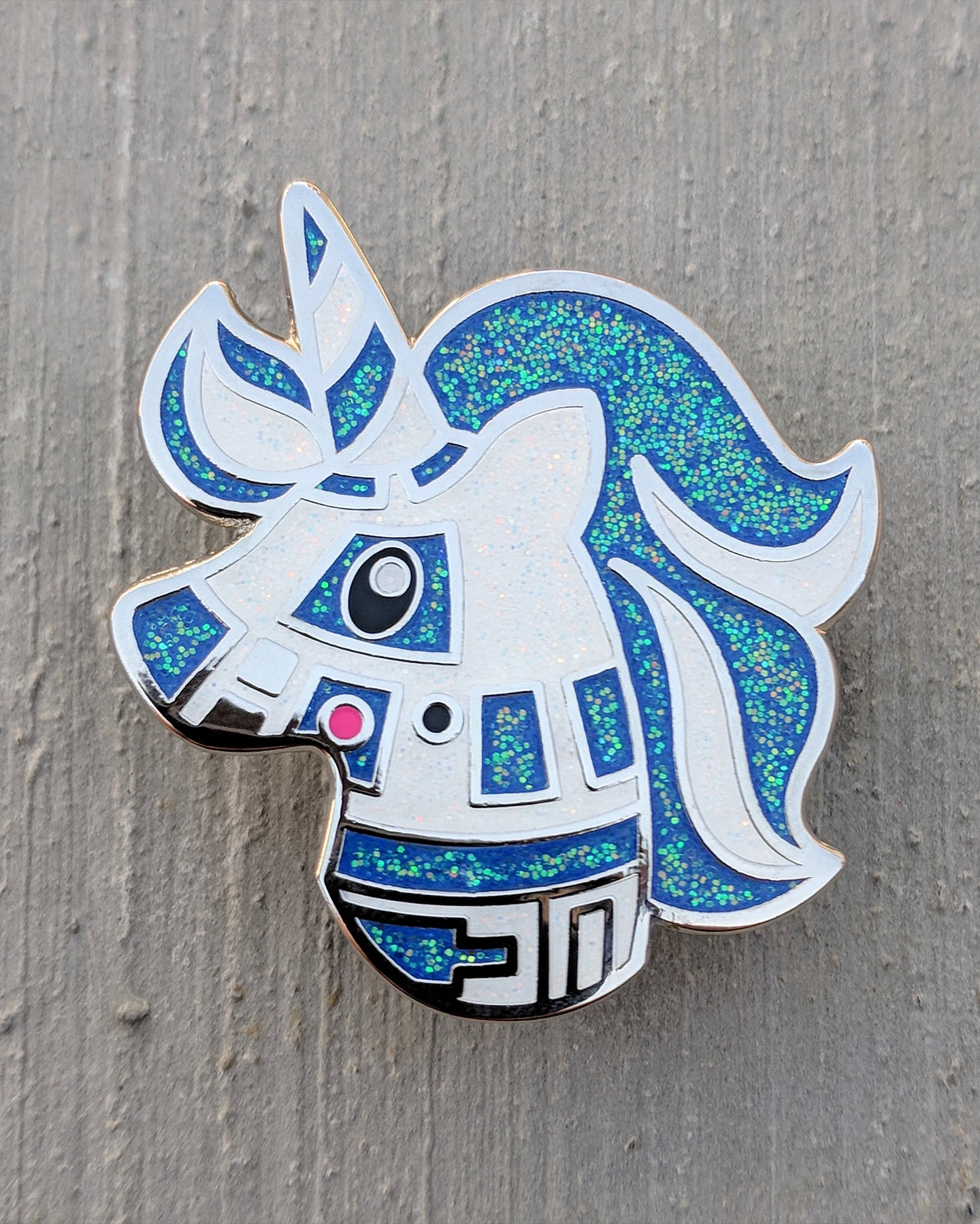 This unicorn pin is a tribute to quick thinking, resilience, and a little spark of ingenuity. Inspired by a favorite resourceful droid, this design blends sleek metallic tones with a touch of magic, because a bright mind should always shine!